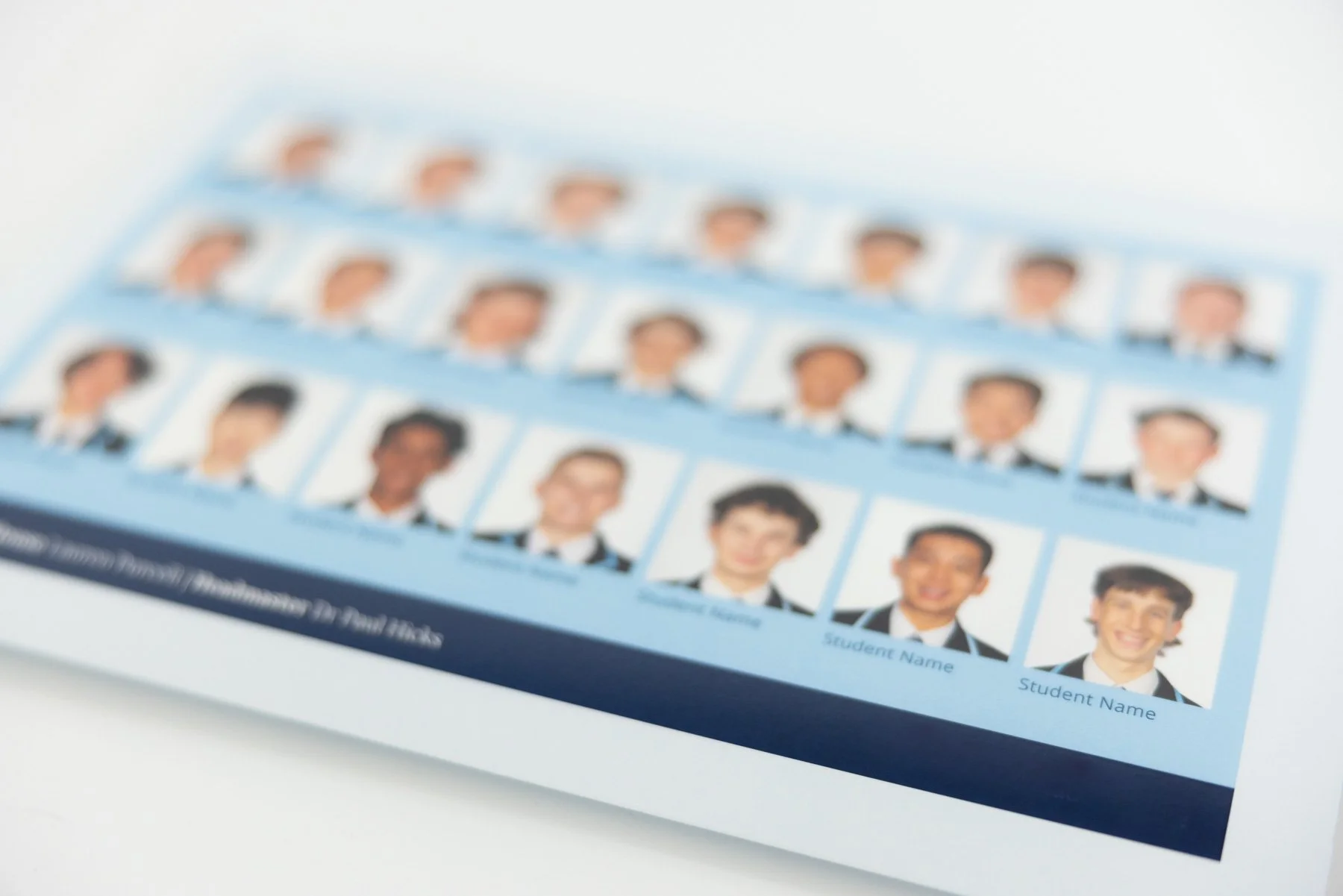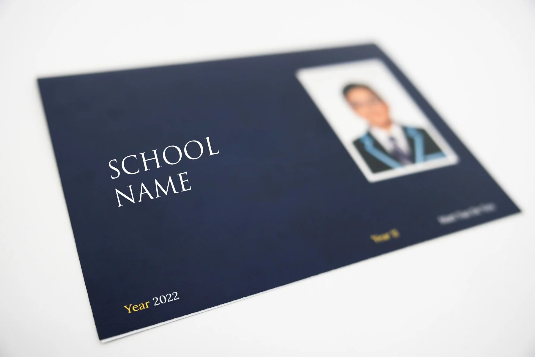 Printed on 300gsm card stock, it is an A3 card folded into A4 size. The cover of the card has a portrait of the student.